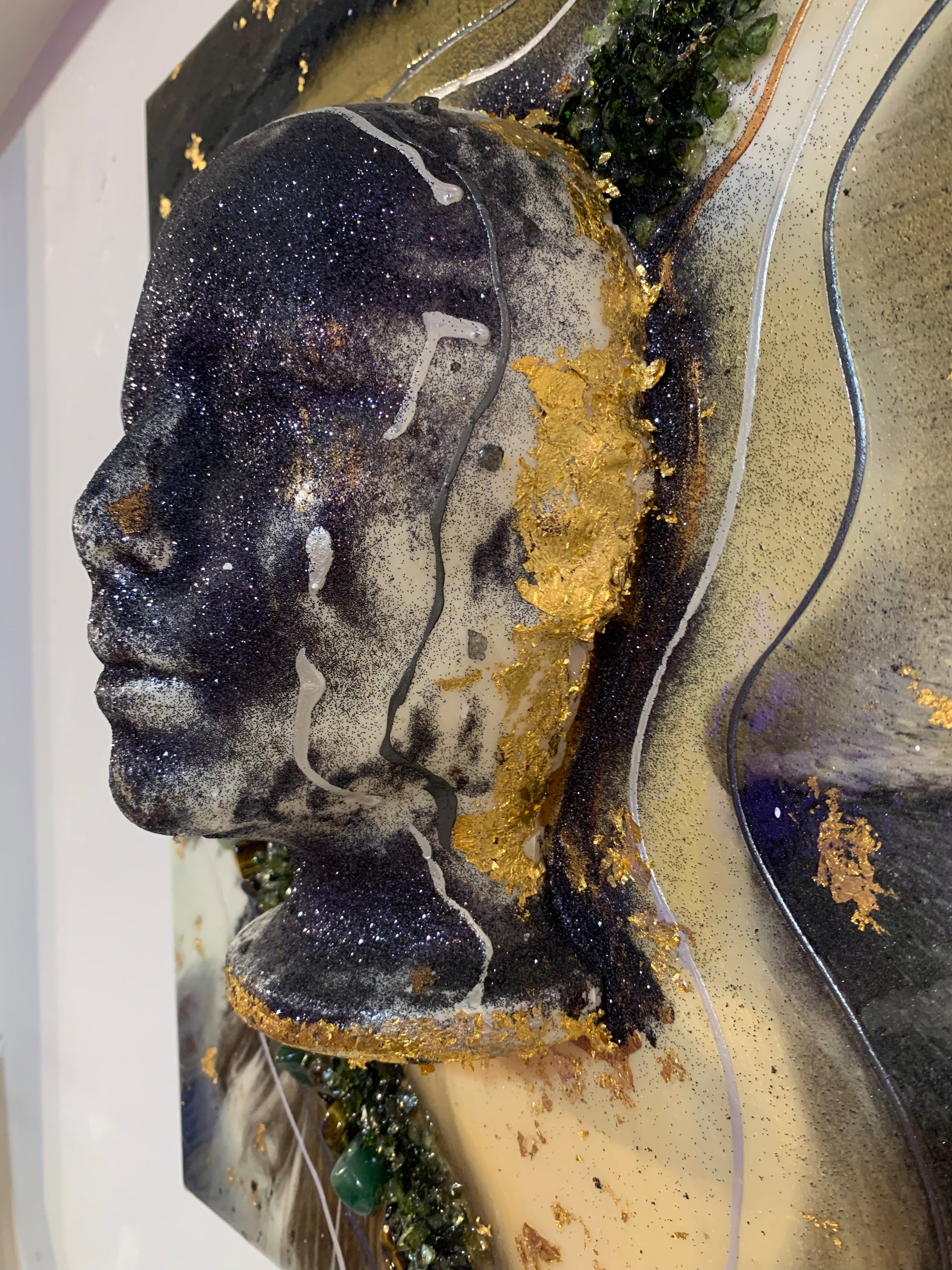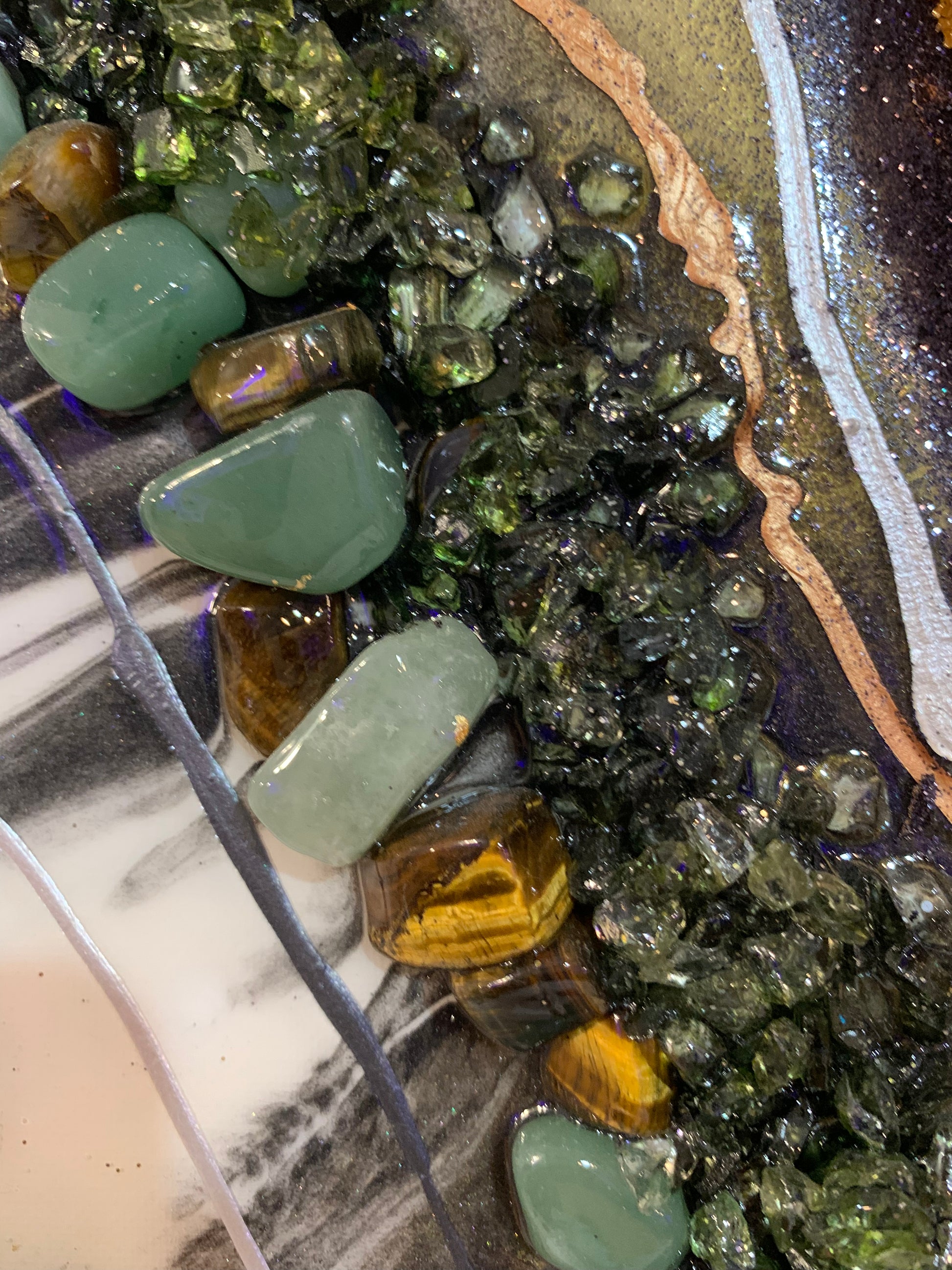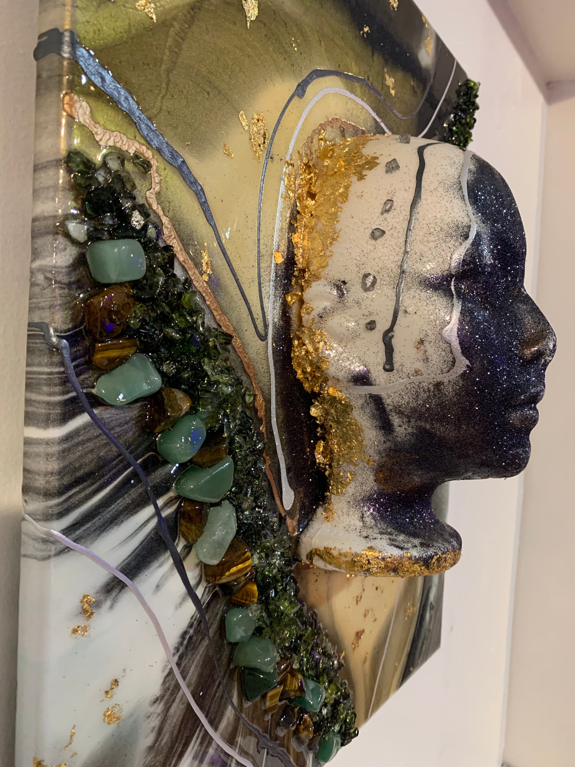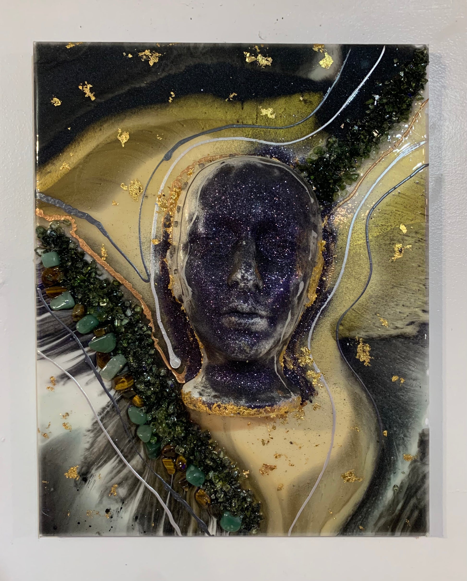 Medium: Resin, foam head, paint, alcohol inks & crystals