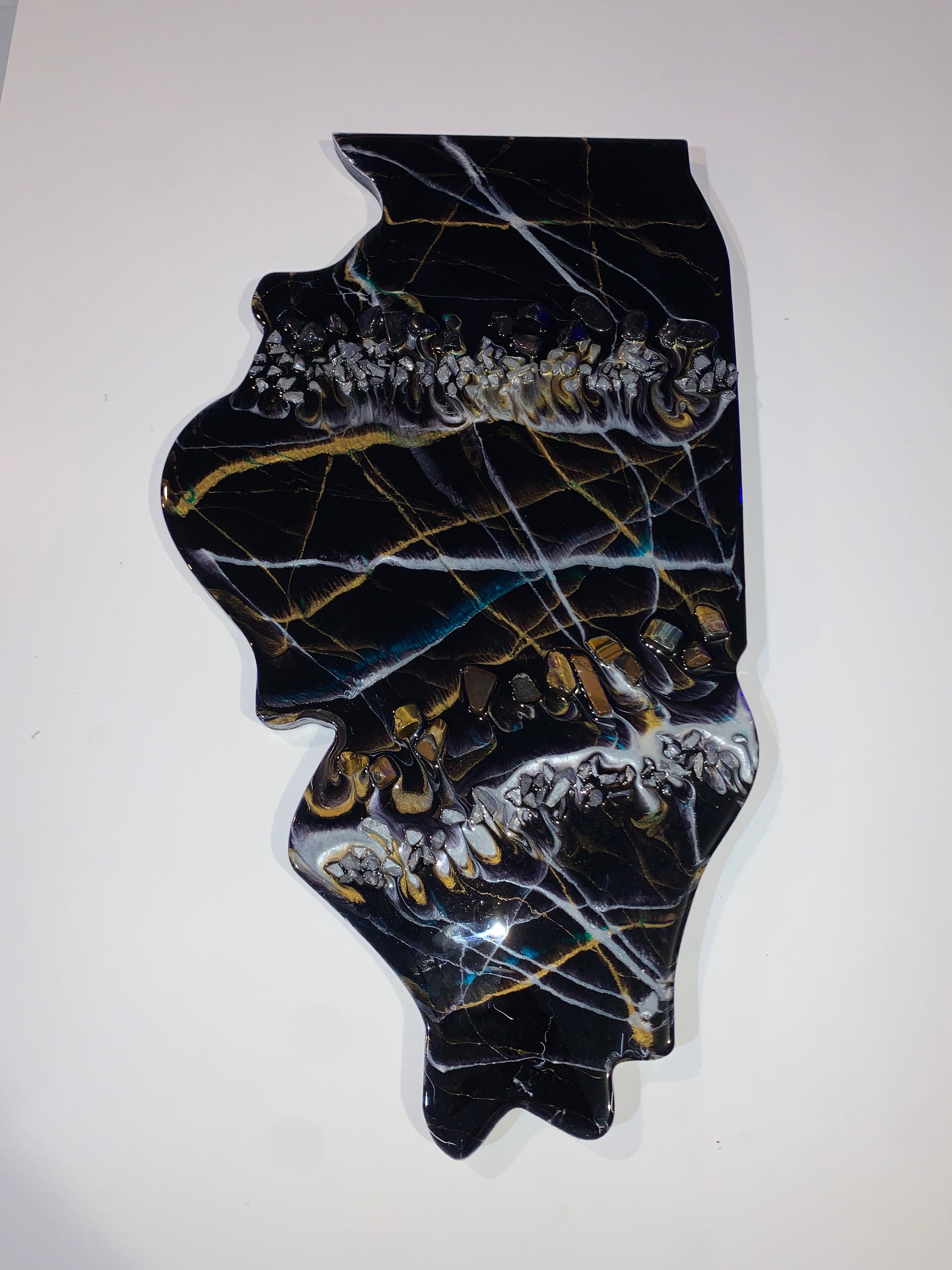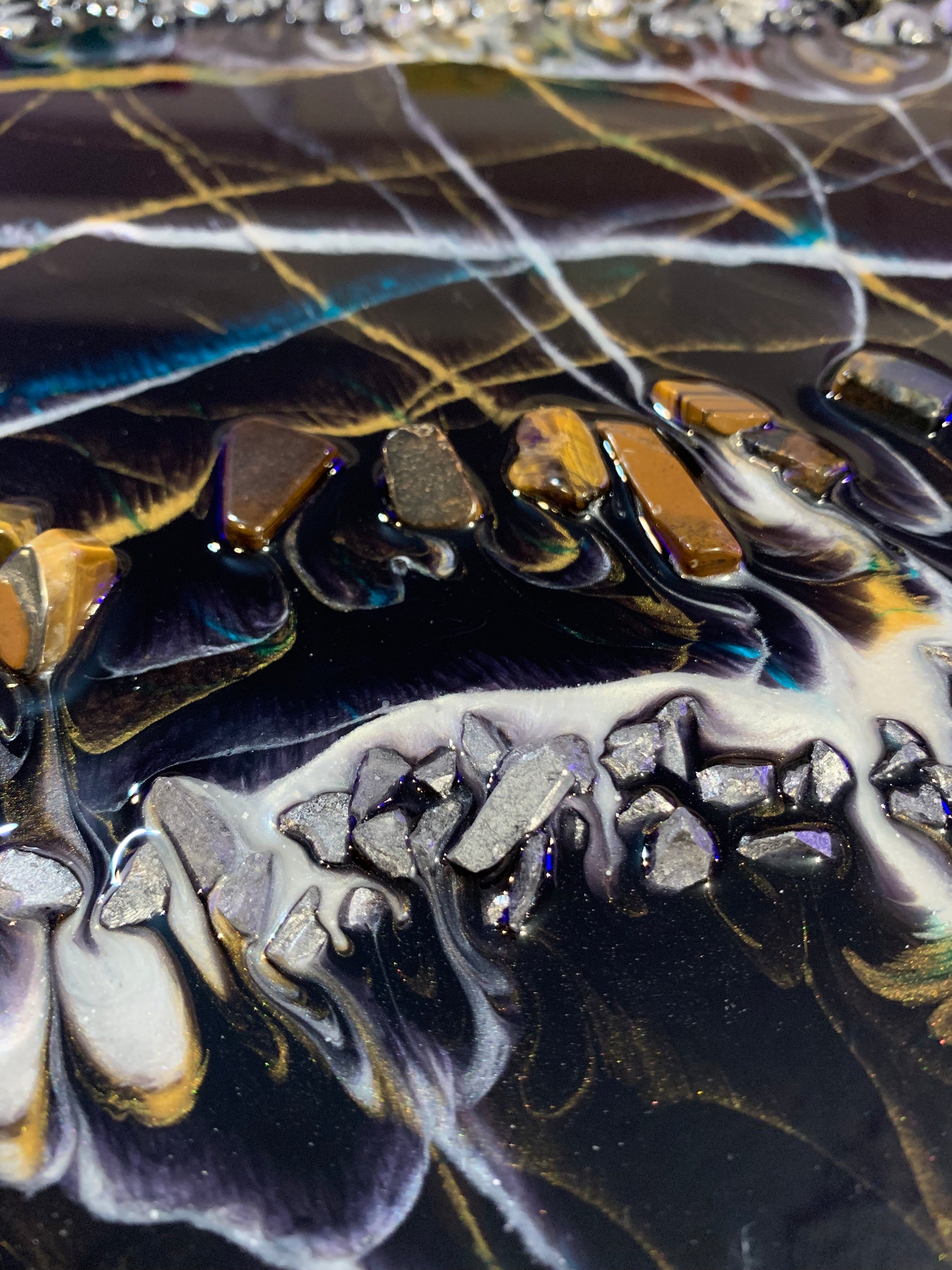 Medium: Wood canvas, Resin, Alcohol inks & Crystals